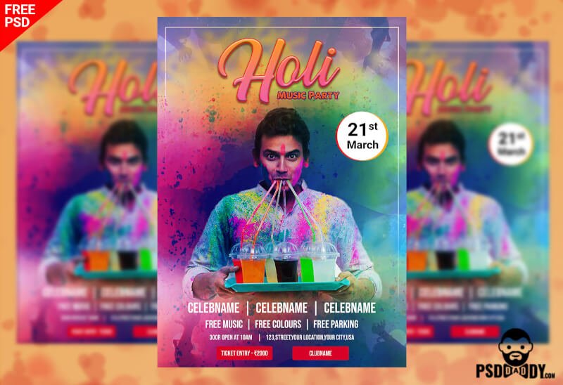 oli Music Party Flyer PSD Template is available to free download.We do know that Phalgun has long been celebrated as a month of romance and Holi is a major event. That’s why we are creating Holi Music Party Flyer PSD Template and the theme is beautiful couple enjoying and celebrating the valentine’s day. Also, Holi Music Party Flyer PSD Template typography will attract more people. The specialty of this ‘Holi Music Fest Flyer Free PSD Template’ is that you will not have to work hard to edit it. The ‘Holi Music Party Flyer PSD Template’  is very special for you, because of this is a free premium template, you can use this free flyer as any Holi Party.  You can use this “Holi Music Party Flyer PSD Template” in your personal and commercial projects. If you are using this file please give some credits to psddaddy.com. Anyway, hope you guys enjoy it and I hope this will help you benefit your project as well. Do not forget to Share if you found this helpful.